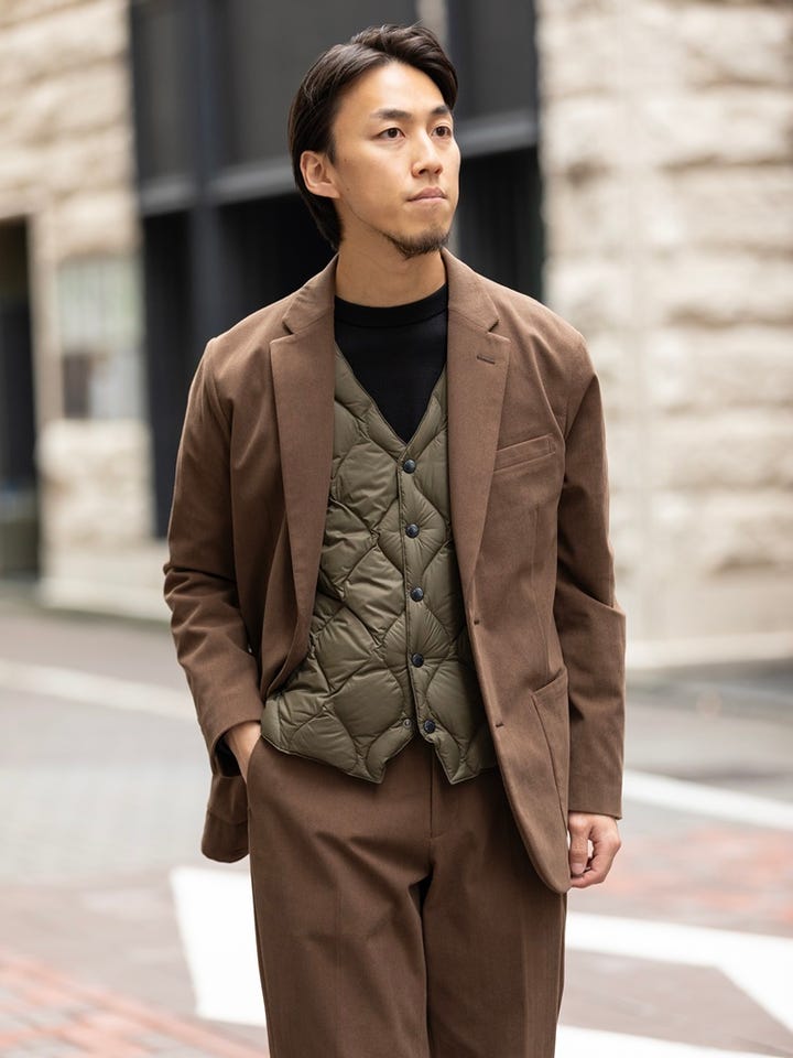 コーデュロイ素材のセットアップは、カントリー要素が強く出がちですがインナーにジレ型のダウンを合わせ、スポーティな要素をミックス。