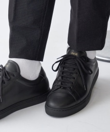 足元にミニマルなブラックのスニーカーが加わることで都会的な雰囲気を演出。