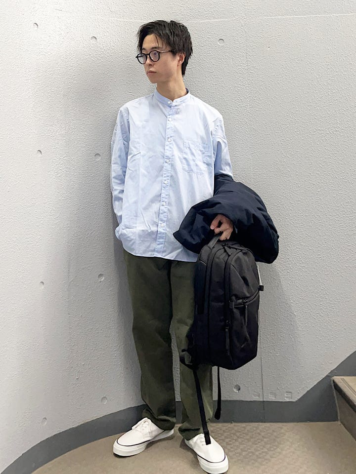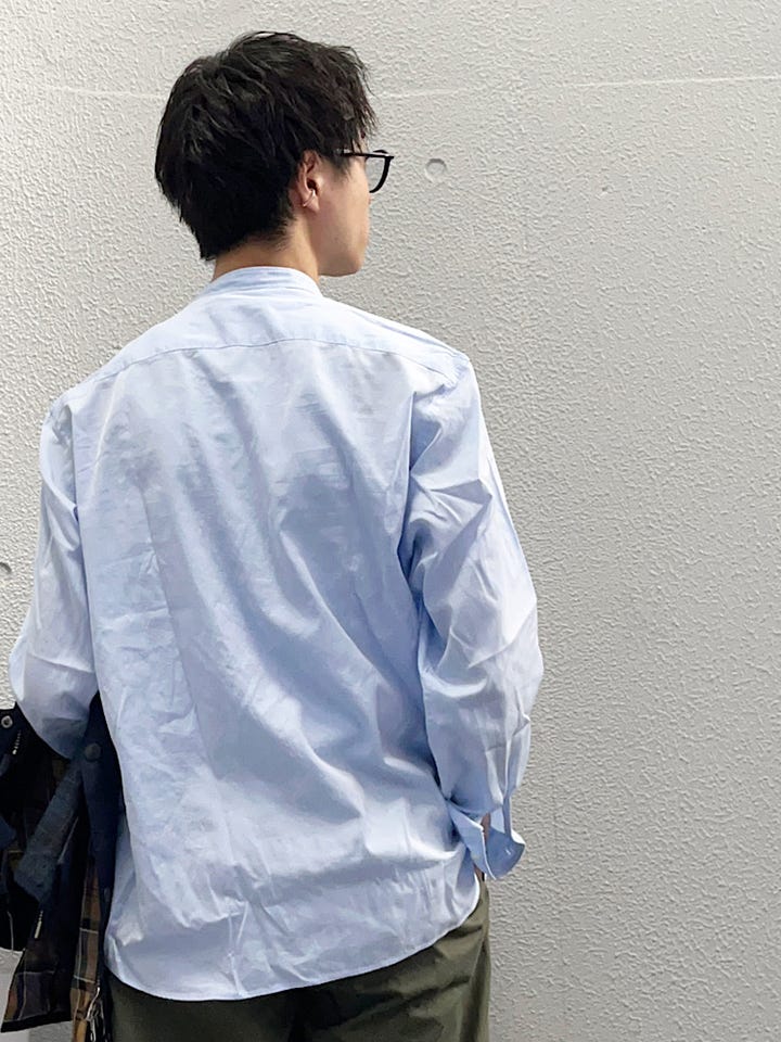 サックスバンドカラーシャツで爽やか好印象コーデ