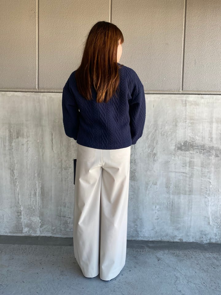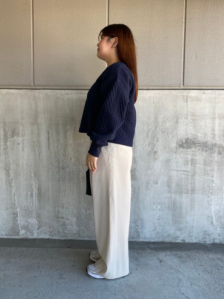 柔らかく履き心地楽ちんですが、程よく落ち感があり表面は微光沢な見た目がラフになりすぎずに着ていただけます!