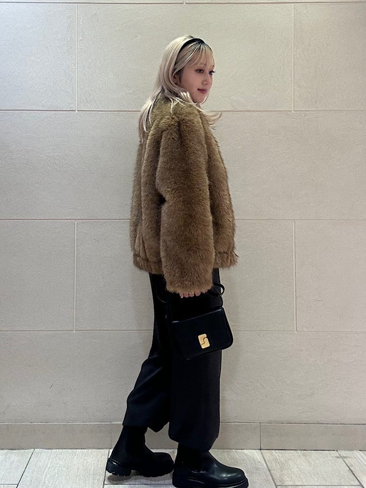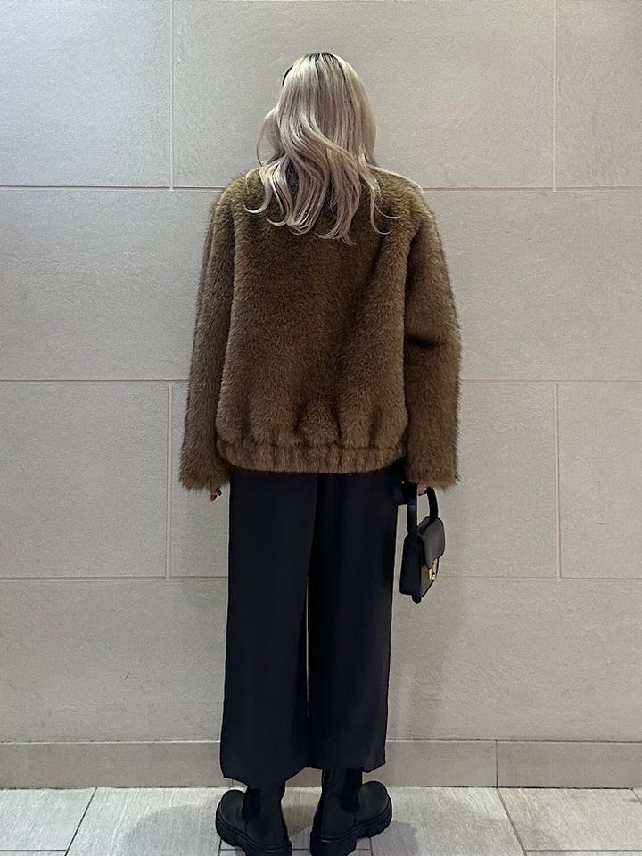 素材感/着心地:ボリュームたっぷりのファーブルゾンなのでとてもあたたかいです。首元はVネックなのでスッキリとした印象に見えます。
