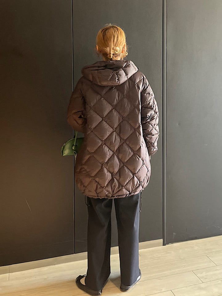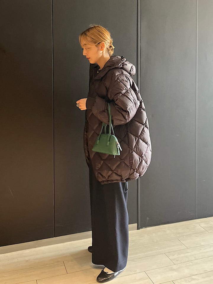 【素材感・着心地】軽く暖かいダウンです。肩周り、身幅は程よくゆとりがある為、インナーを選ばず着用できます。裾のドローコードで、シルエットの変化を楽しめます