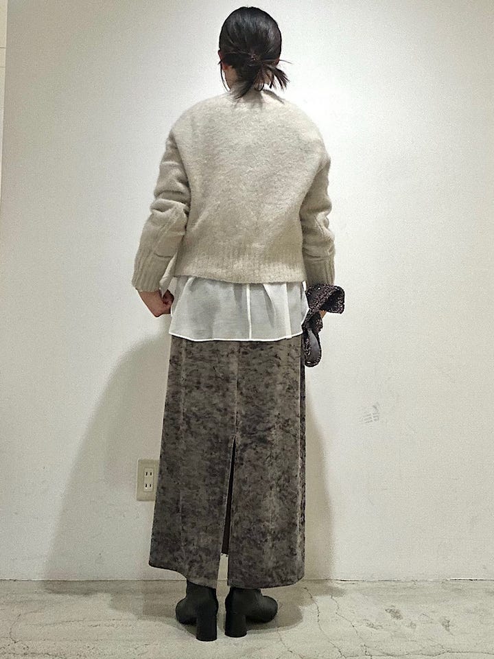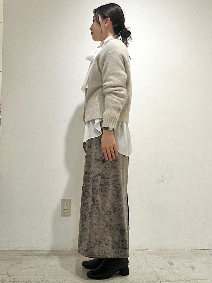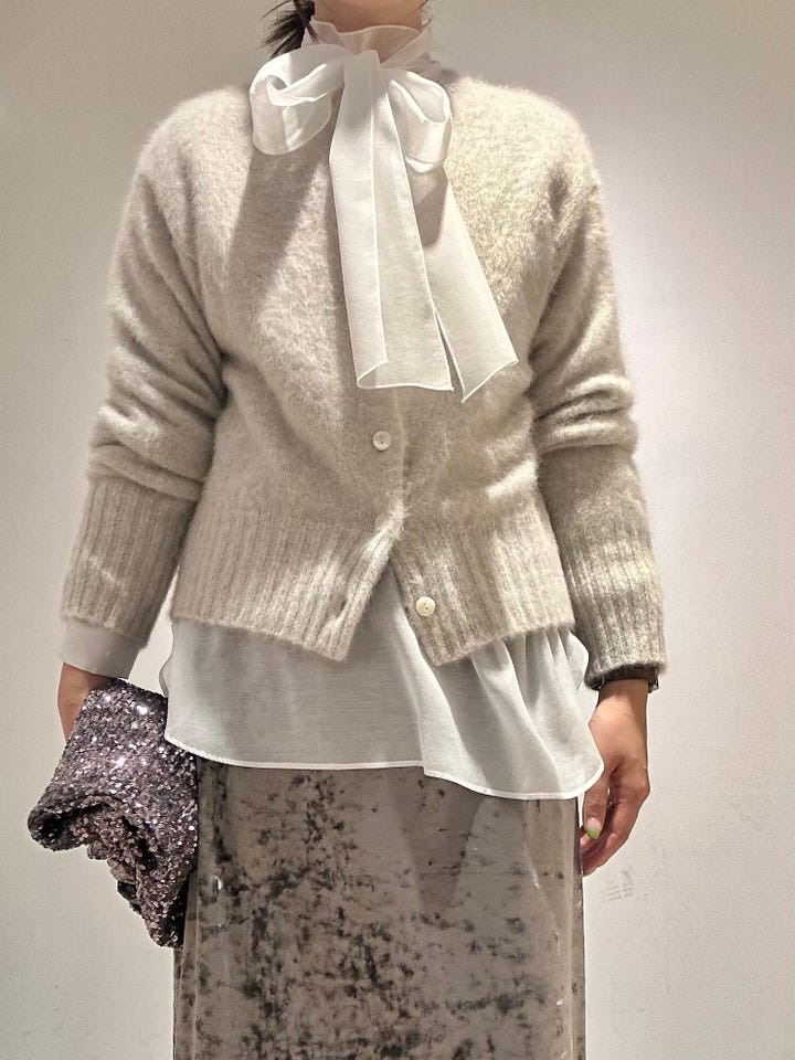 柔らかく暖かい上質な素材とボウタイブラウスの合わせは大人のデート服やセミフォーマルなスタイルにぴったり◎