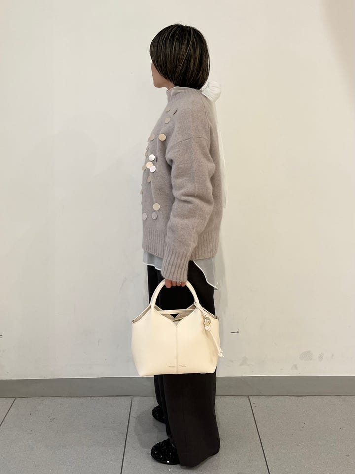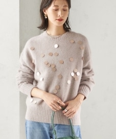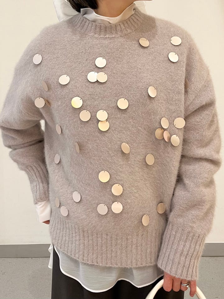 着心地:フォックスの毛を使った軽くて暖かいニット。重さを全く感じないです。スパンコールが一枚でも華やかに見えます。