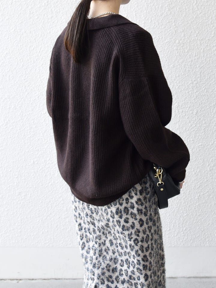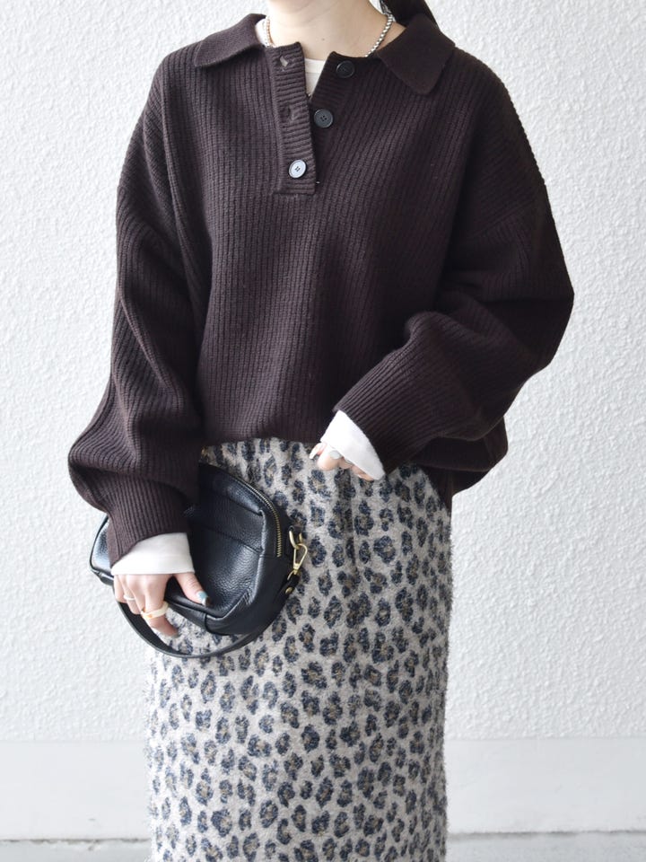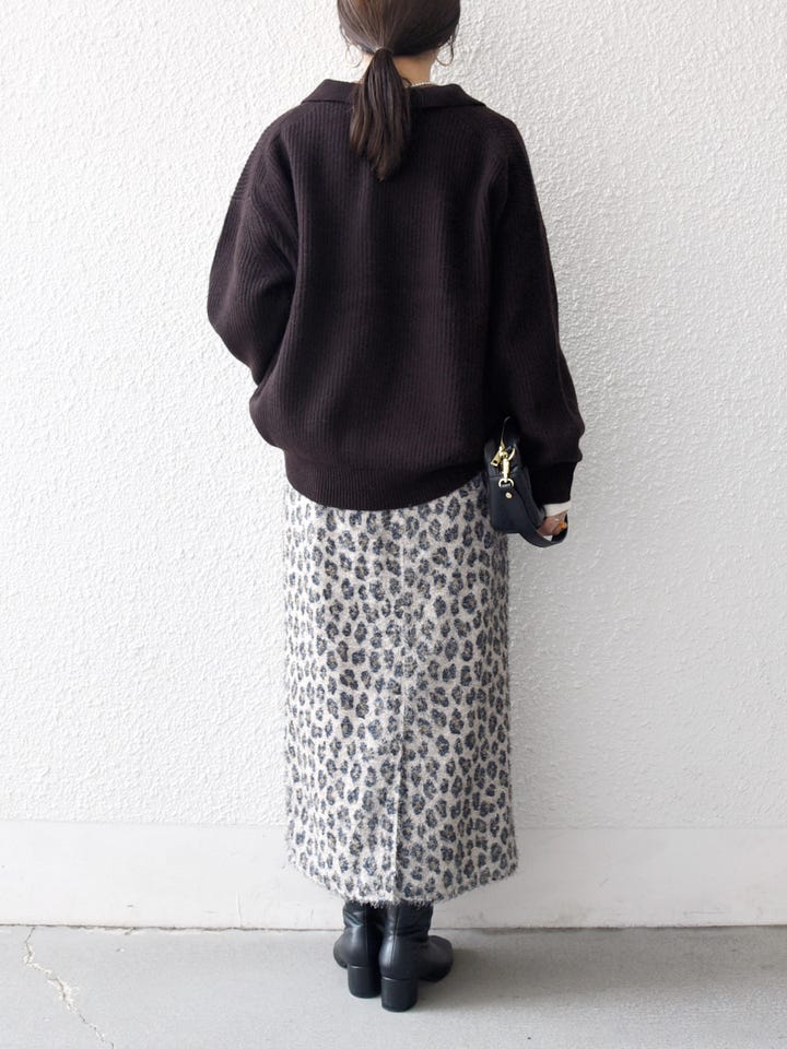 レオパード柄スカートを主役に、ブラウンのニットで落ち着いた印象に。