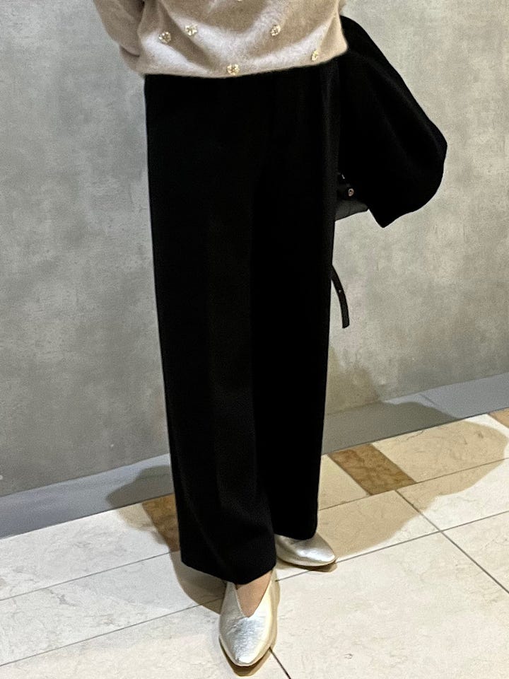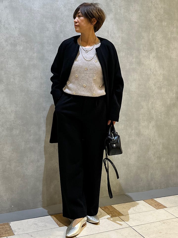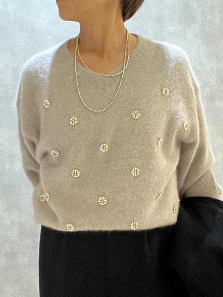 着用感 : フォックスウールで薄手ですが着た瞬間に暖かいです。ビジューのデザインがとても上品なニットです。