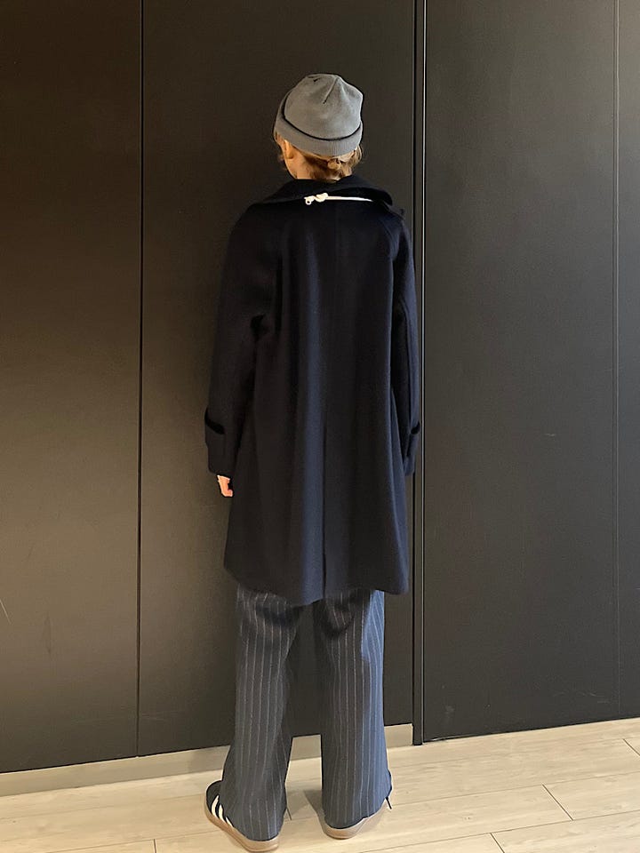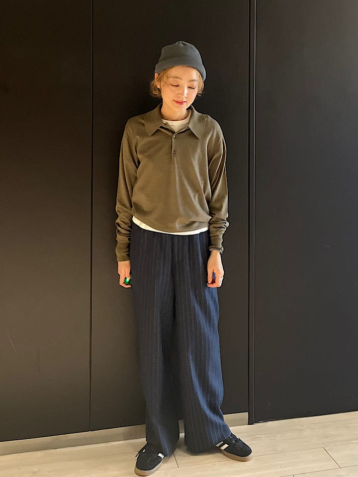【素材感・着心地】薄手のウール/コットン素材。メンズでの展開ですがSサイズで程よくゆとりがあり、着用しやすいです。一枚での着用はもちろん、ジャケットのインナーなどにもおススメです