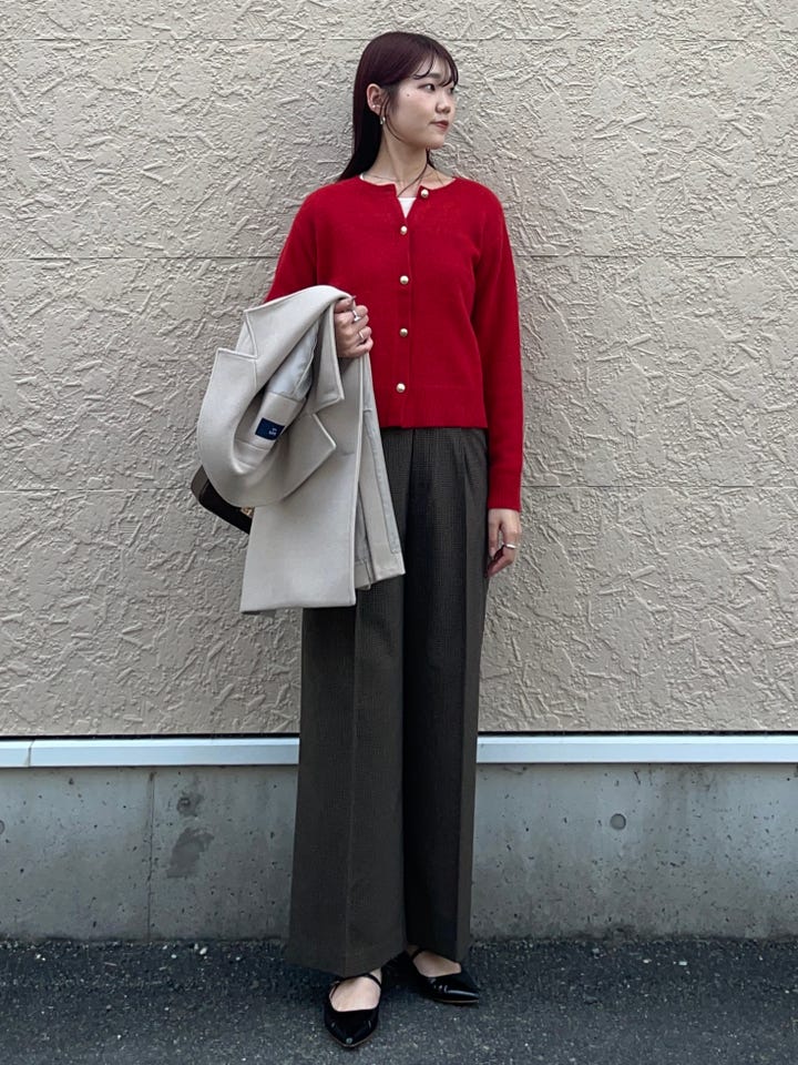 薄くて暖かい素材。丈は少し短めなので、ワイドパンツやスカートなどと合わせやすい。