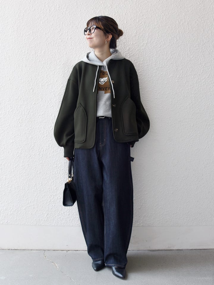 サイズ感:ヒップにかかるくらいの丈感。中にパーカーやニットを着用出来るゆとり感あり。