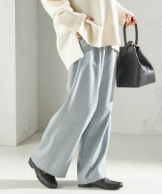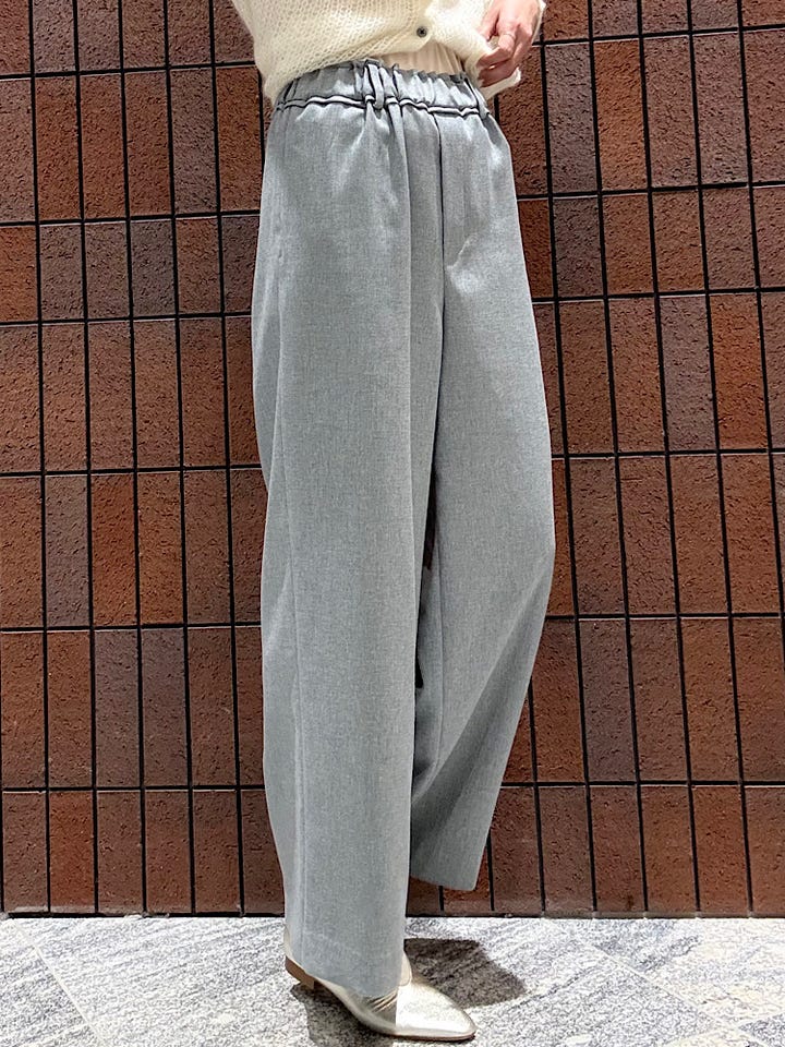 着心地:ウエストゴム仕上げのイージーパンツですが、ツイル生地でほんのり張りがある風合いなので、形良くスッキリ穿いていただけます。色味がライトブルーで淡く、カラーで遊んでスタイリングできるパンツです!