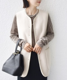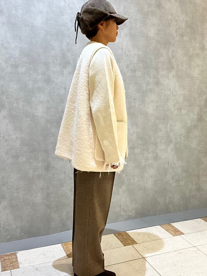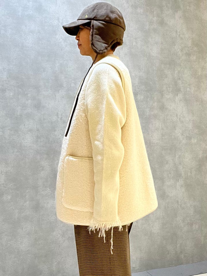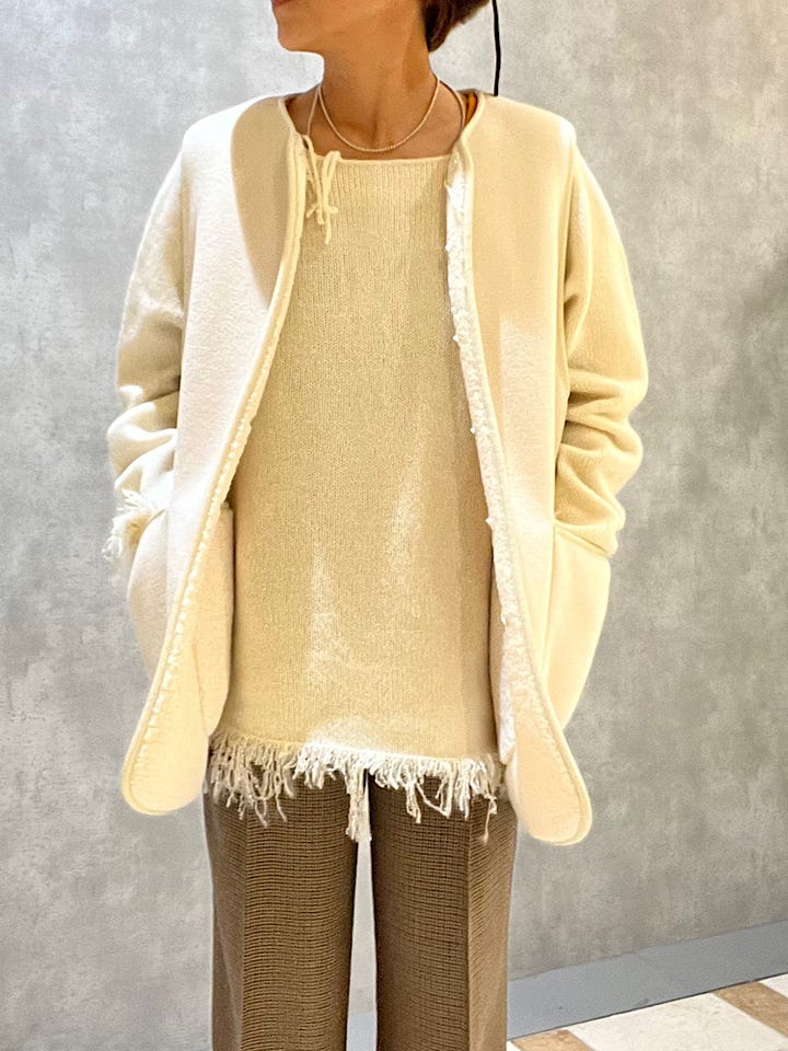 着用感 : あまり厚手ではなく、襟も開いているのでインナーでコーディネイトを楽しんで頂く事が出来ます。