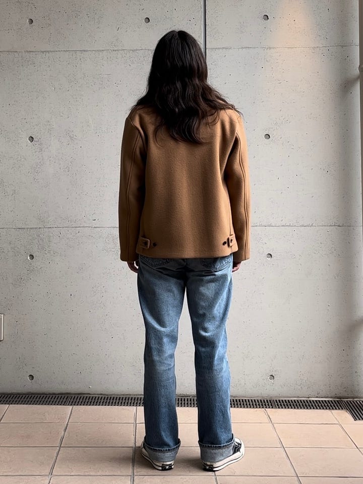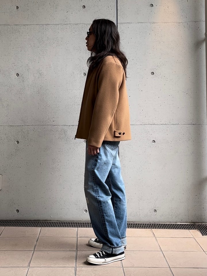 デートやお買い物などにお使いし易いコーディネート提案です。ジャケットは大人見えして、幅広い世代の方に合わせ易いジャケット。中のインナーはコットンとカシミヤなので薄くて暖かく、お洗濯も可能です。参考にいかがでしょうか。