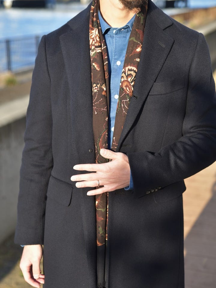 ウール/カシミヤのチェスターコートを使用したスタイリング。