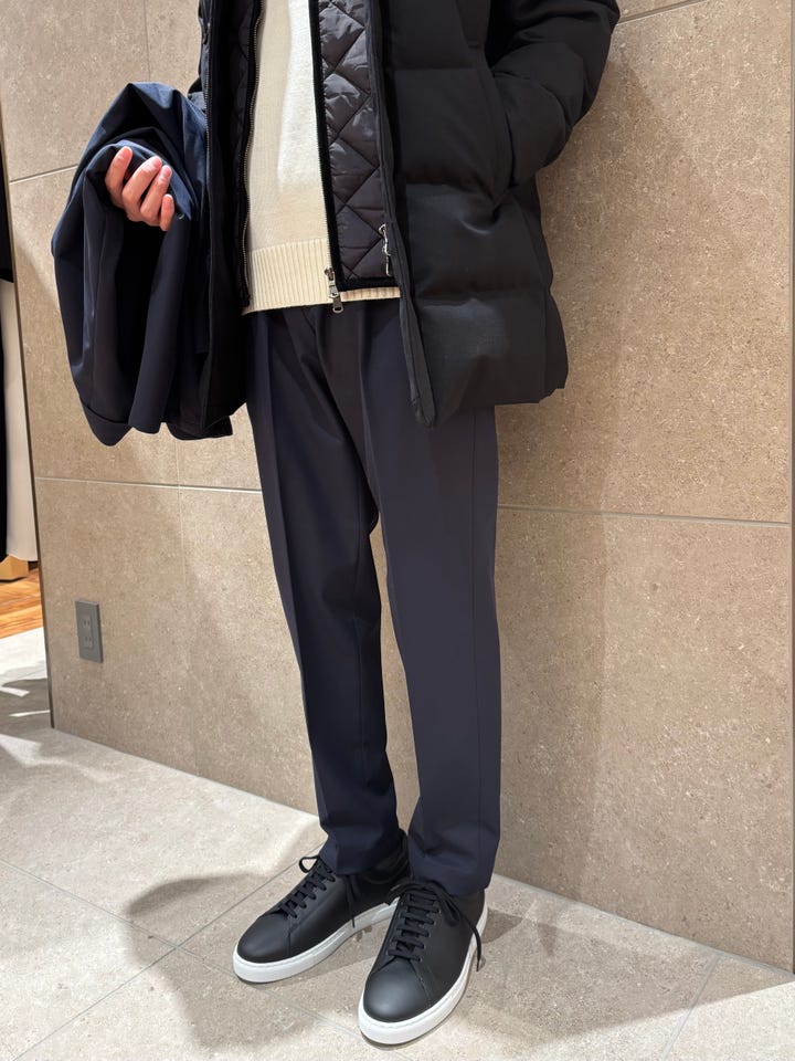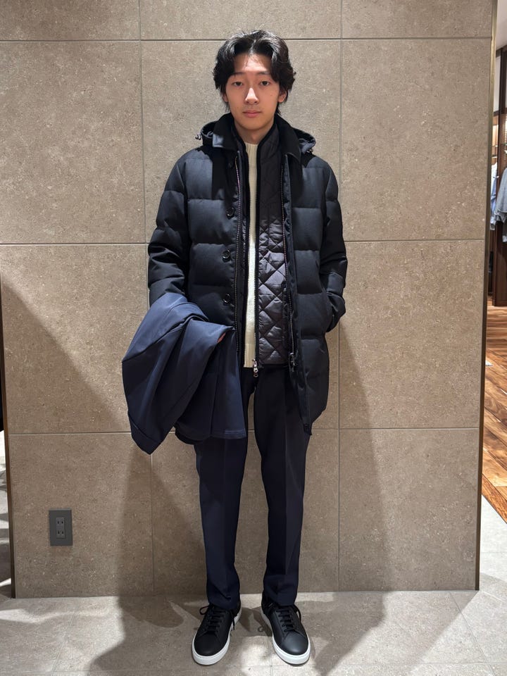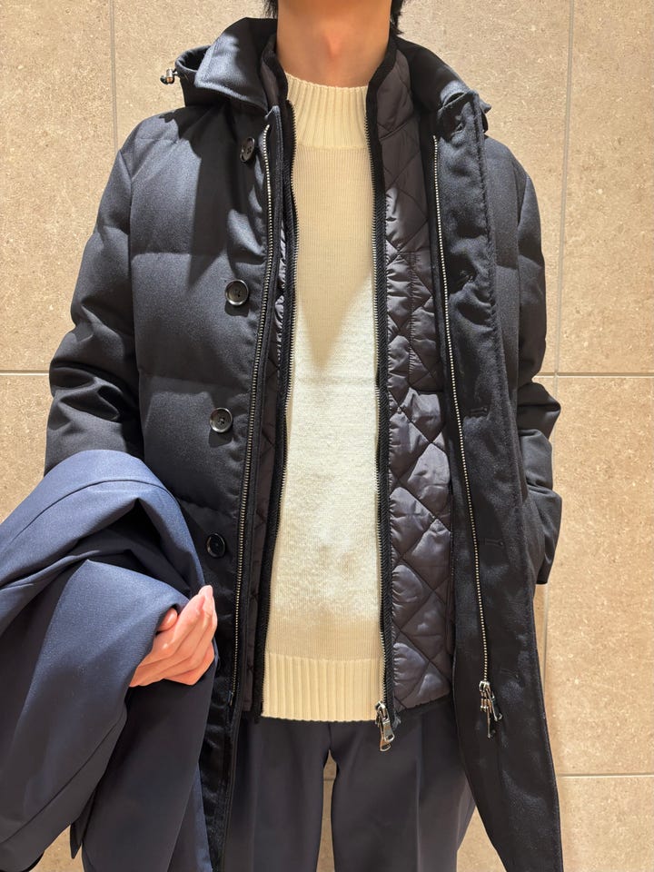 写真のようなビジネスカジュアルスタイルから、フードを外すことも可能なので休日スタイルまで幅広くご着用いただける1着です。