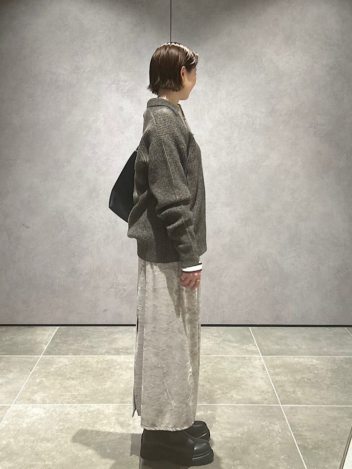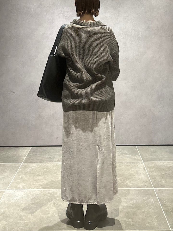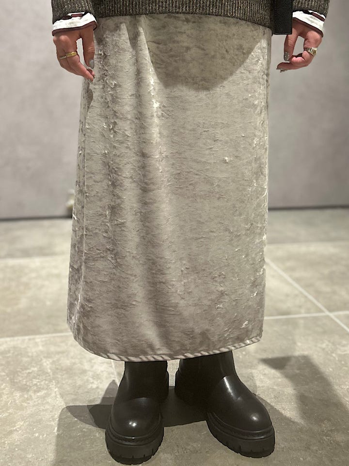 素材感/着心地:ベロア素材なので夏終わり?冬まで着用いただけます。Iラインのスカートなのでオーバーサイズのトップスと相性が良いです。