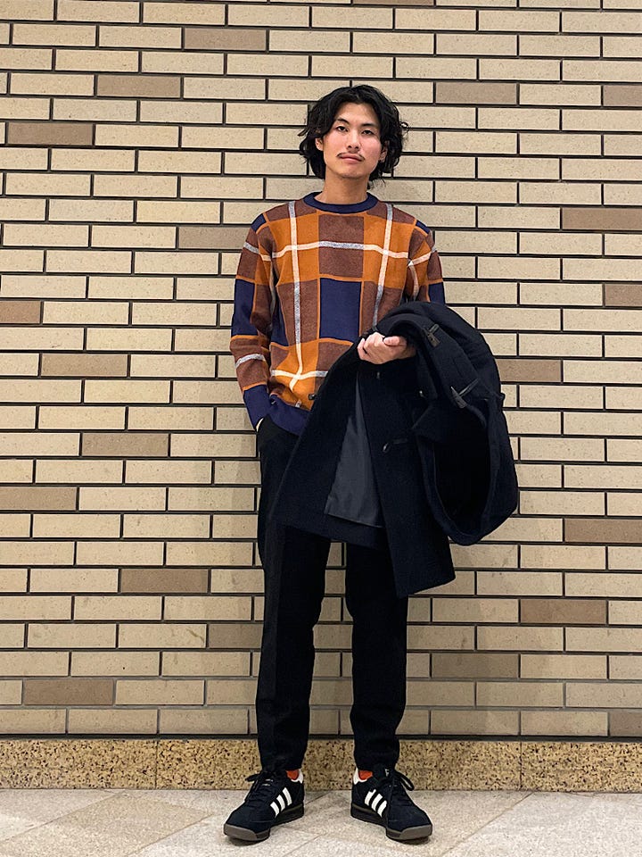 サイズ感:ジャストサイズ、中に厚手のニット着用できるサイズ感です。
