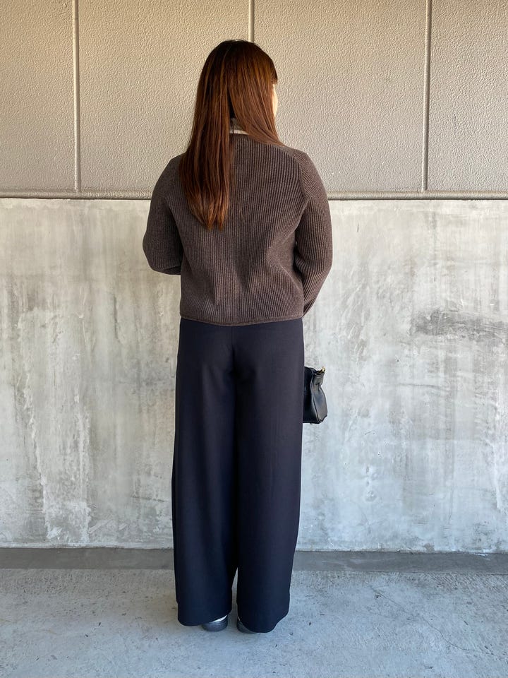 着心地:形がとにかくきれいなワイドパンツです。ワイドシルエットですがストンと落ち感のある素材でボリューム気にならず着ていただけます。ウエストは後ろゴムで楽に履けました!