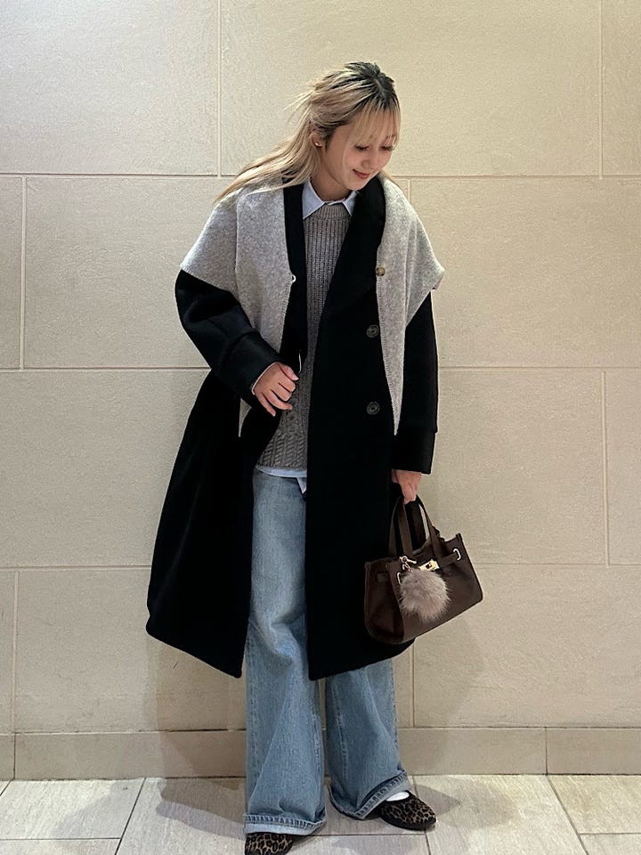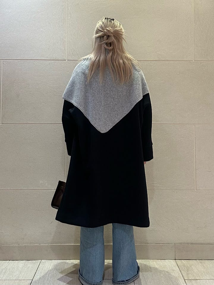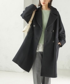 素材感/着心地:全体的にゆとりがありますが、女性らしいシルエットのコートになっています。ウール100%で保温性もあり軽いので疲れにくいです。