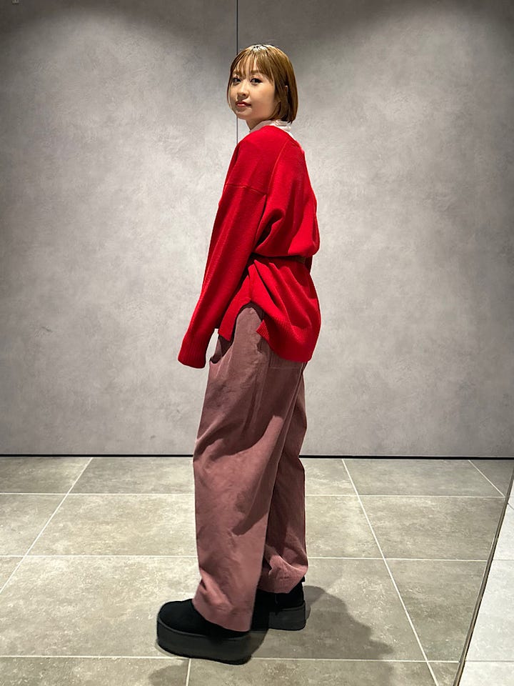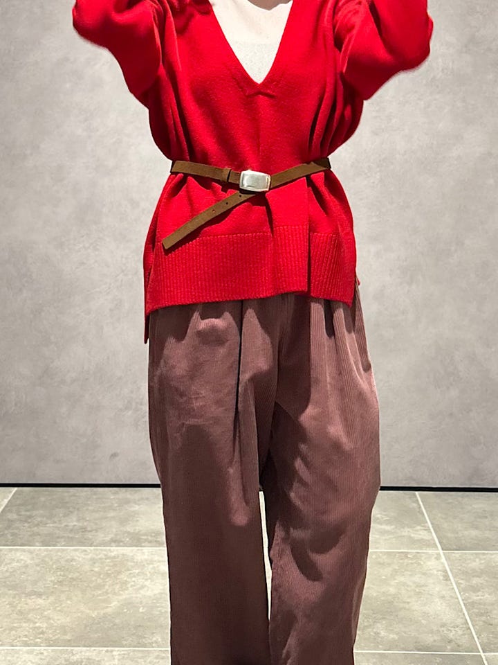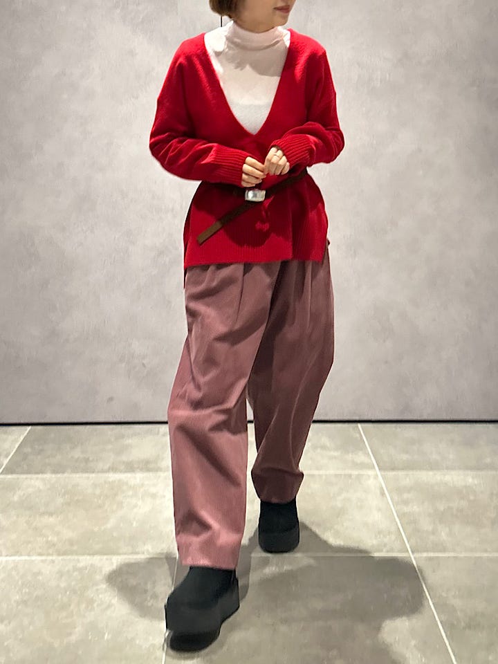 素材感・着心地:ワイドすぎないシルエットでトップスを選ばず着ていただけます。やわらかなコーデュロイと温かみのあるカラーでほっこりしたスタイリングに。
