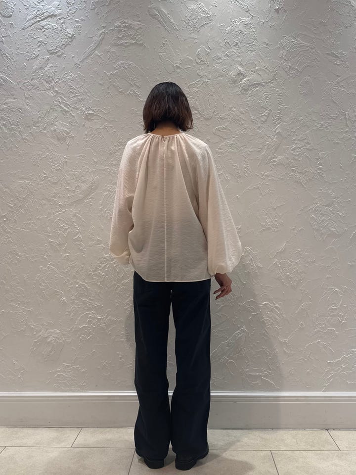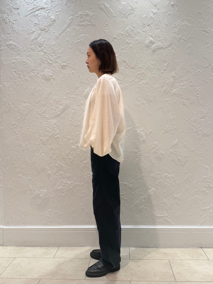 サイズ感・着心地:サイズゆとりあり。シアー素材のためインナーは選びます。ぽわんと広がる袖が可愛い!前後で丈の長さが違うので、インせず着てもシルエット綺麗です!うしろはお尻が隠れます!