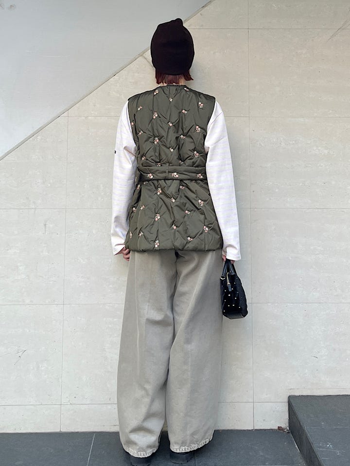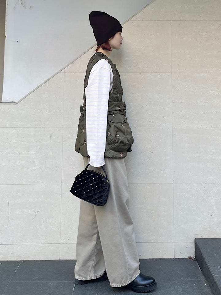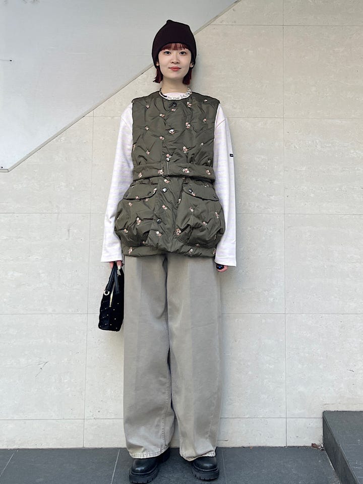 着心地:シンプルなトップスと合わせるだけで可愛いコーデになるアイテムです。カーキに薄ピンクの刺繍がとてもキュート。シルエットは広がりが少なくとても使いやすいと思います。