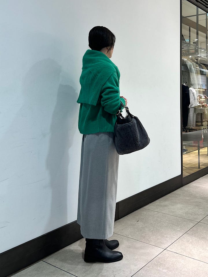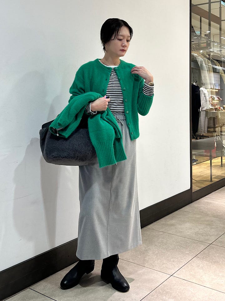 着心地:フォックスの柔らかい質感のニットカーディガンです。着丈は短めですが、アームホールがゆったりしているのでニットの上にと羽織ることができます。