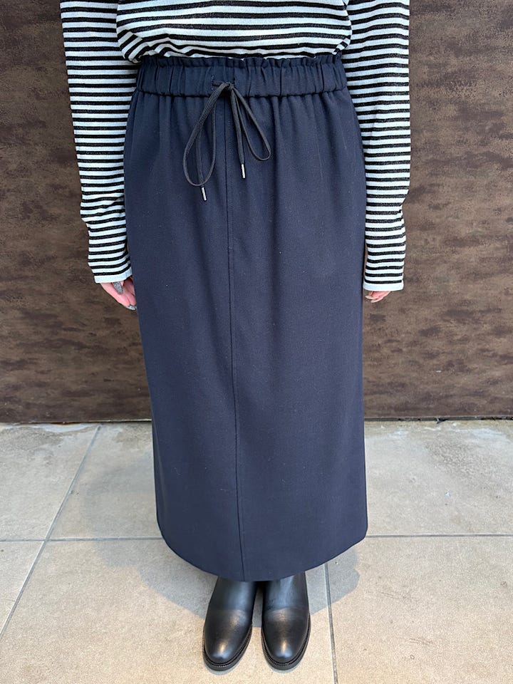 着心地 :ウエストゴムでノンストレス。ONESIZEでも150cm前半の方が長すぎない丈感で着れるのも嬉しいポイント。