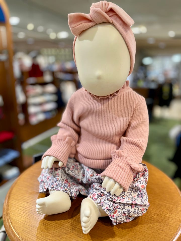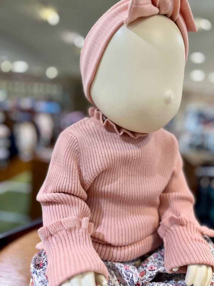 首元と袖のフリルが可愛らしいニットはコットン素材と伸縮性のあるリブ編みで着やすさ、着せやすいトップスです。