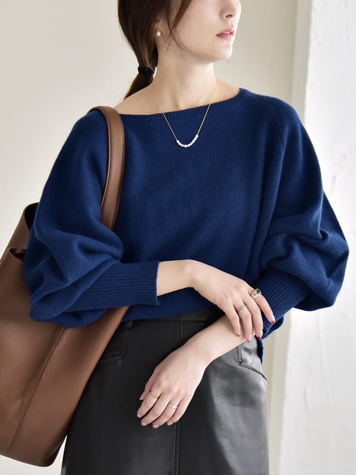 〔ONE SIZE〕quaranciel:〈手洗い可能〉AQUA カシミヤ ミックス ボートネック ロングリブ パフ ニット