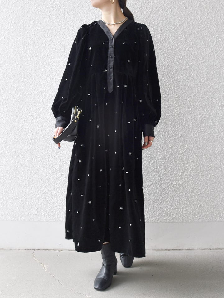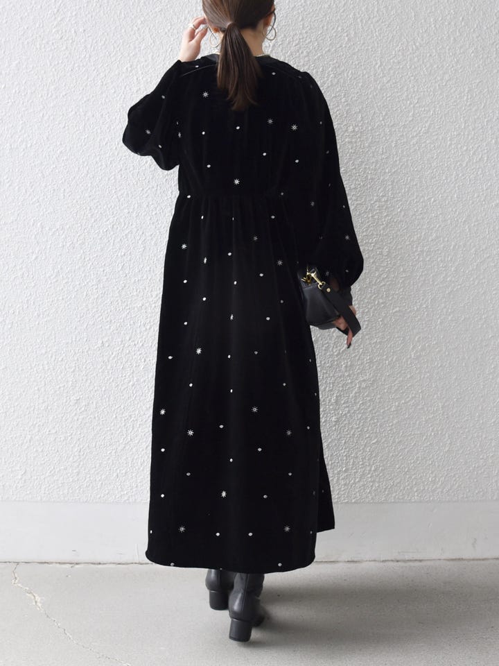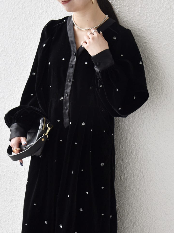 刺繍が華やかなベロアワンピースを主役に、シンプルな小物を合わせて上品に。