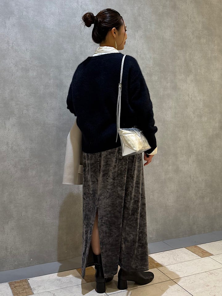 着用感 : トレンドのベロア素材スカートです。ウエストの締め付け感が全くなく、ストレスフリーな着心地です。
