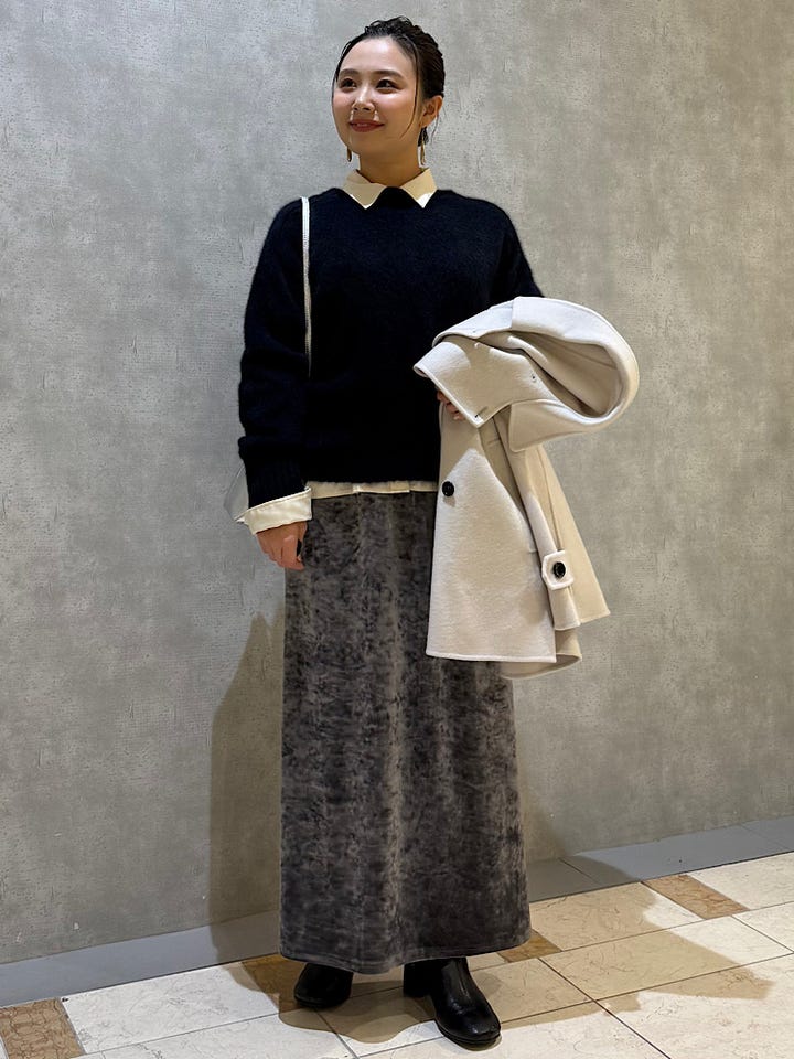 着用感 : ふわふわな素材感がとっても可愛いニットです。見た目もふわふわですし、着用してもふわふわな柔らかい肌あたりです。保温性が抜群なので暖かく過ごしていただけます。