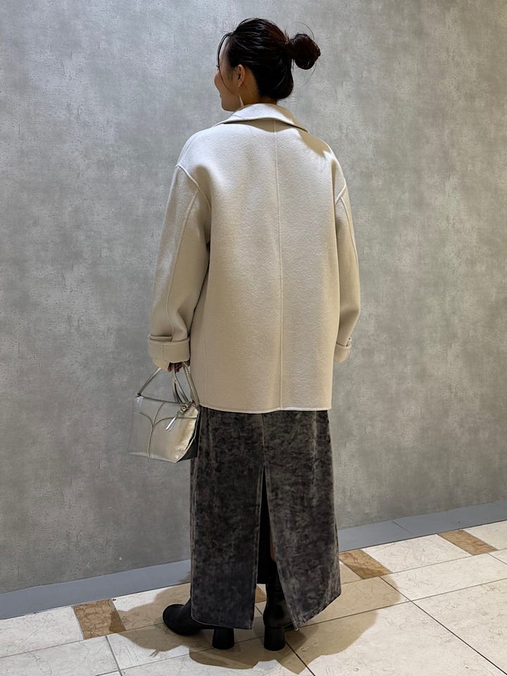 着用感 : ざっくり羽織れるオーバーサイズが着映えするハーフコートです。袖丈がやや長かったので折り曲げて着用しています。ハーフ丈なので重みもなく楽な着心地です。身幅が広めで中にたくさん着込めるのも嬉しいポイントです。