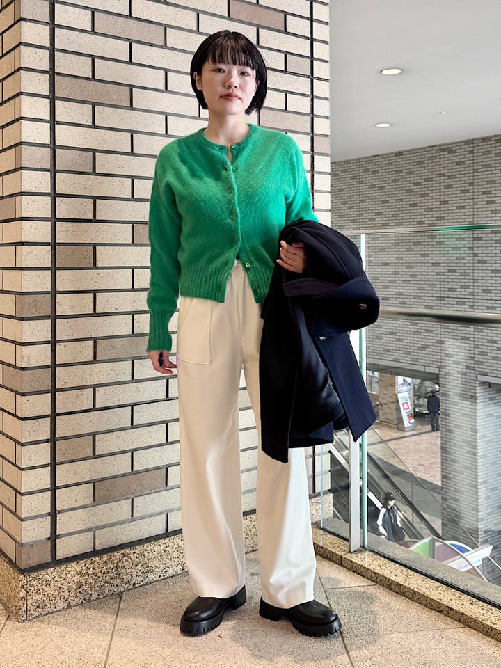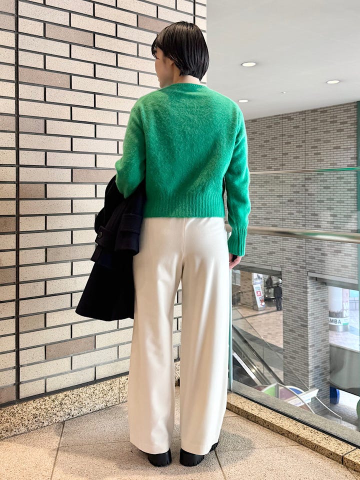 スカートでもパンツでもどちらでも合わせやすいデザインです。