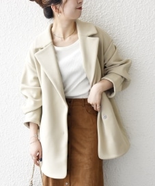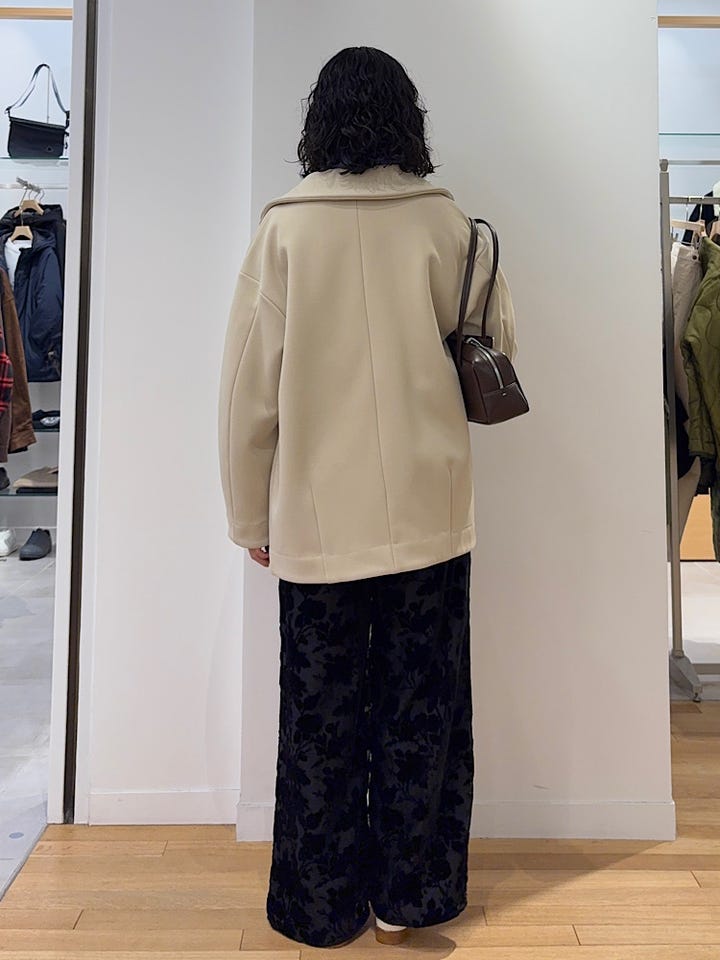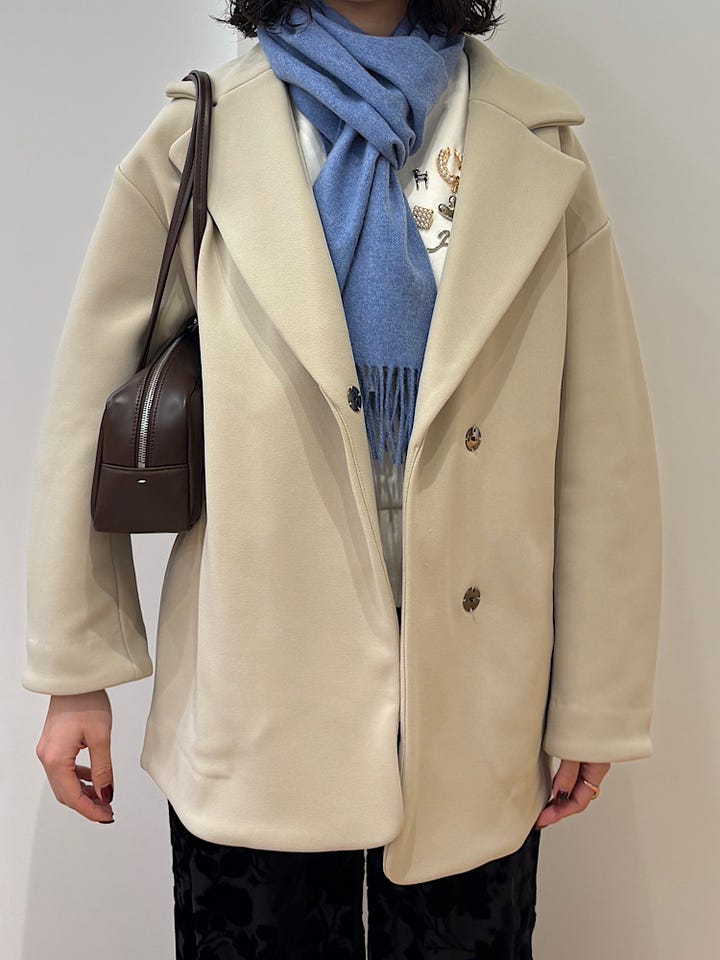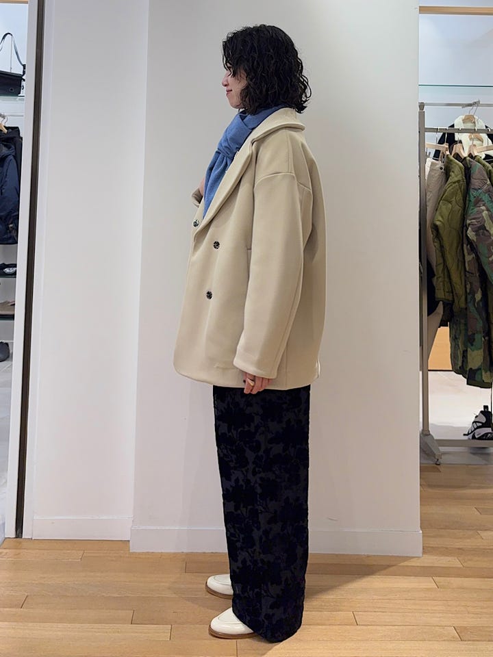 ジャケットとウールコートの中間くらいのアウターで、割と肉厚な質感です。サイズ感は大きめなので、中は着込んでいただけます◎