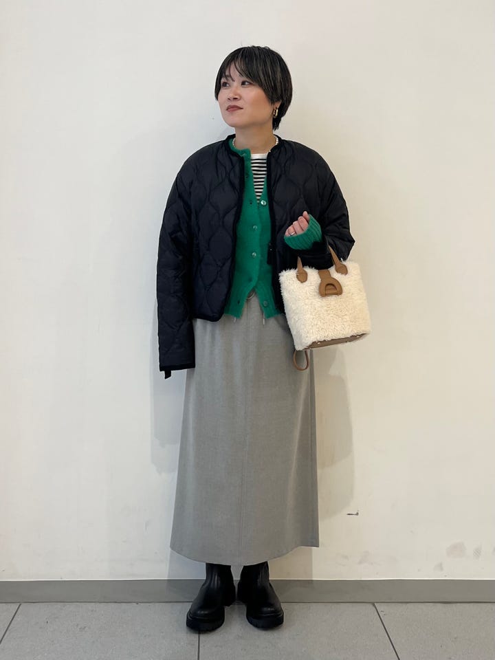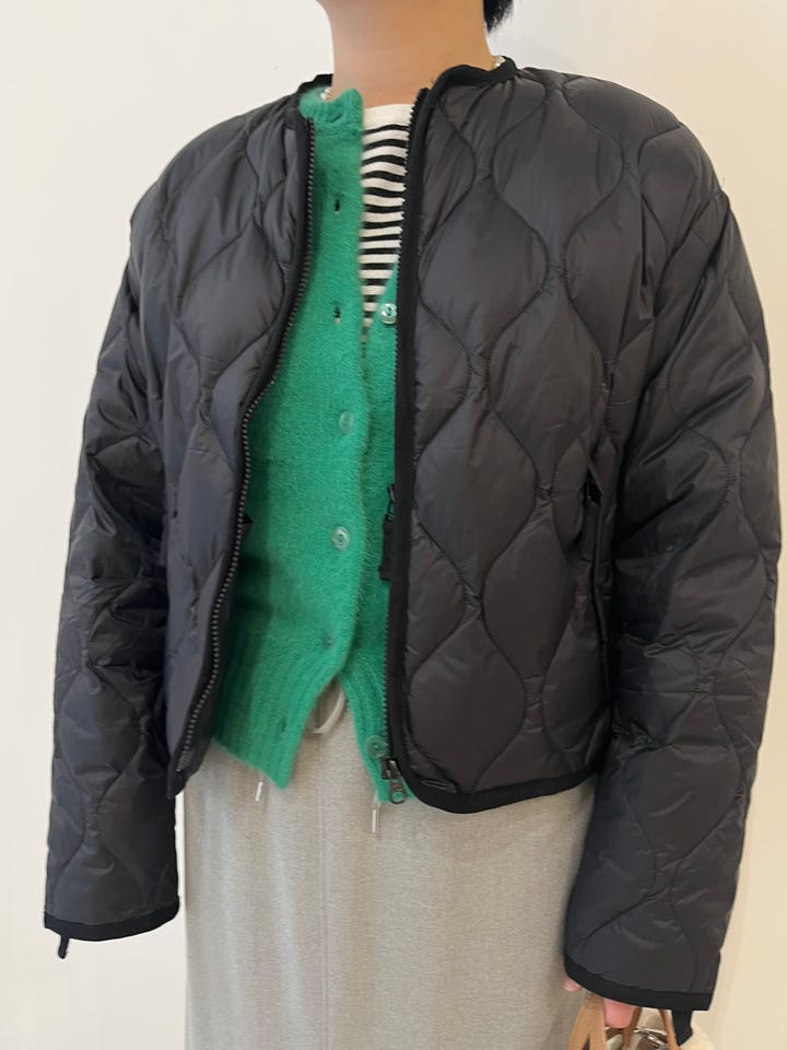 着心地:とても軽いです。インナーダウンとして使えるサイズ感、デザインになっています。着丈が短い為ハイウエストボトムスやスカートがおすすめです。