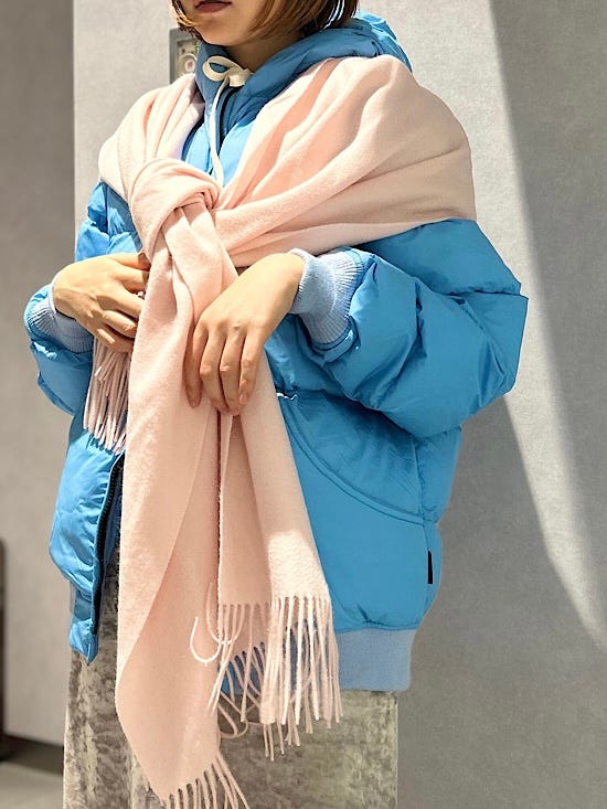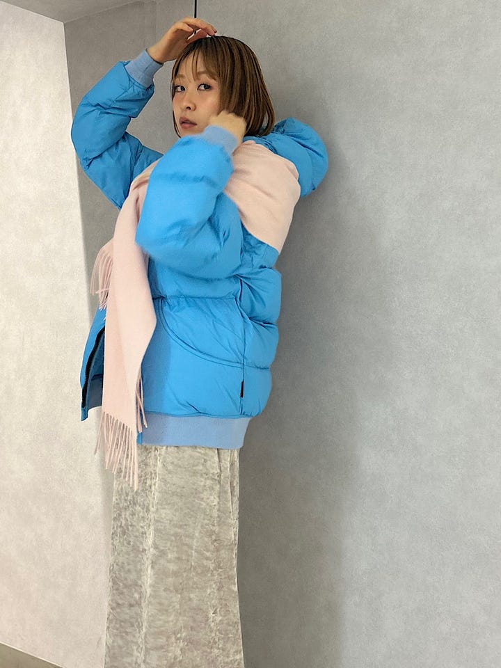 素材感・着心地:メンズ仕入れですがコンパクトなシルエットなので女性にもおすすめです。もちっとした素材感は軽くて着やすいです。パーカーのようなドロストがフードに付いているのがカジュアル感が増してかわいいです。
