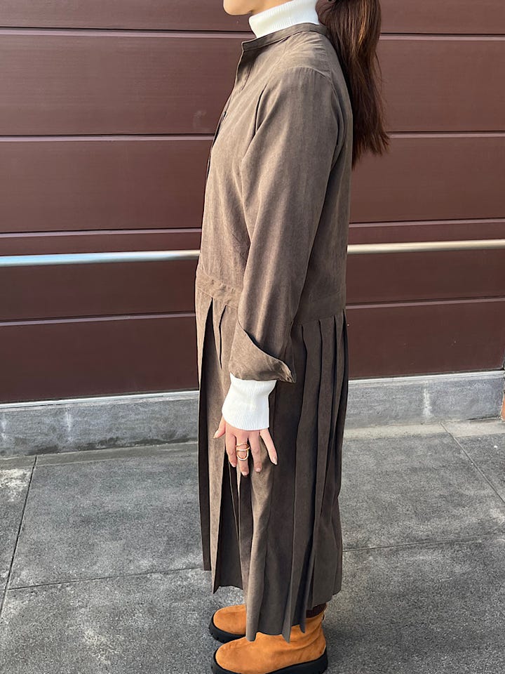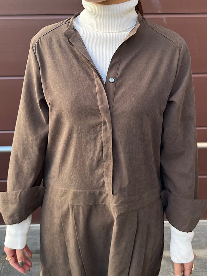 素材感・着心地:首元はスキッパーデザインで身幅もゆったりとしています。プリーツがあることで大人エレガントに着用できます。