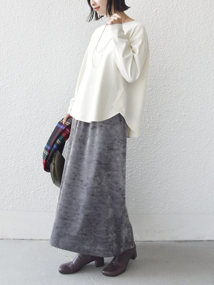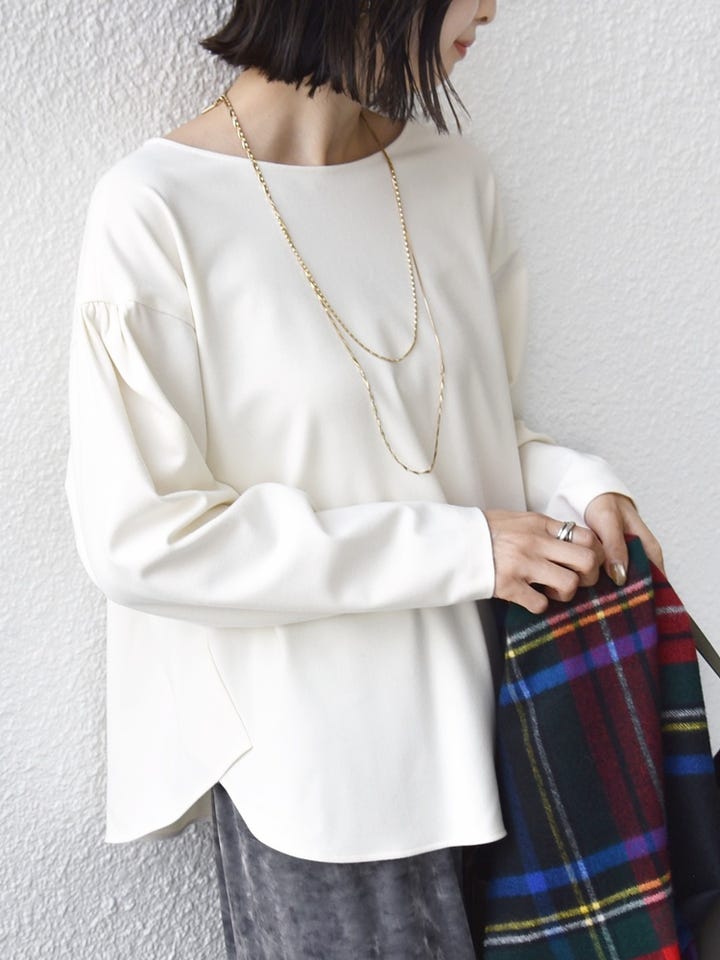 着心地:スウェット感覚で着れるきれいめプルオーバーです。裾のラウンドカットは横や後ろから見た時も可愛らしく、ニュアンスのある着こなしを楽しめます。