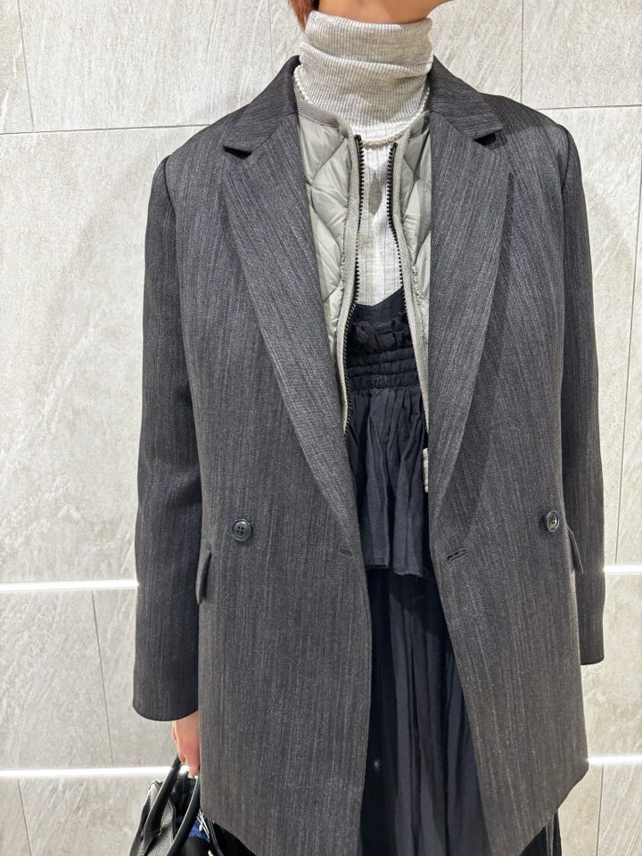 素材感・着心地:ウールライクなポリエステル素材。程よくゆとりがある為、中にインナーダウンも合わせることができます。