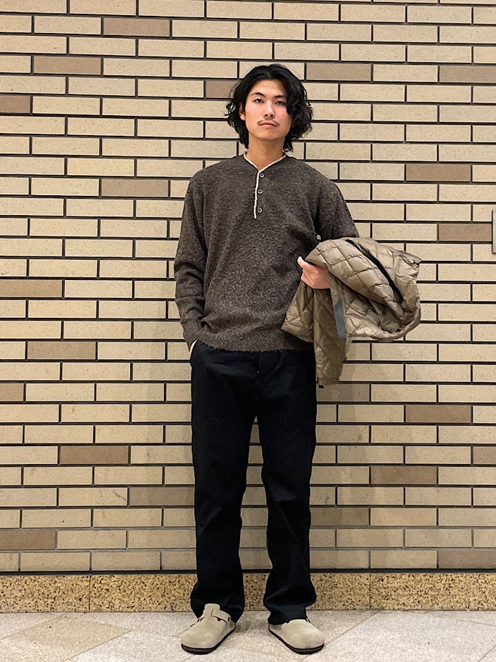サイズ感:ゆったり目、中に厚手のニット着用できるサイズ感です。