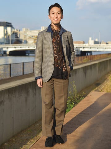 サイズ感:ややゆとりがあるサイズ感。肩回りにはゆとりがあり、ジャケットを着ていてもストレスがない。