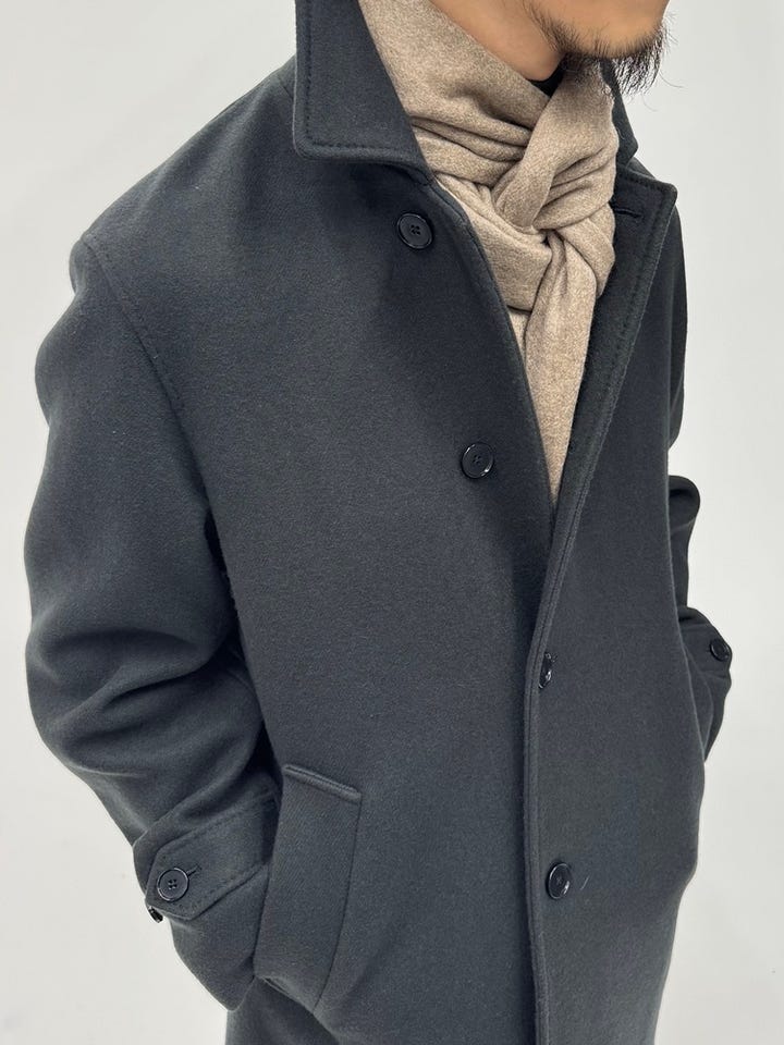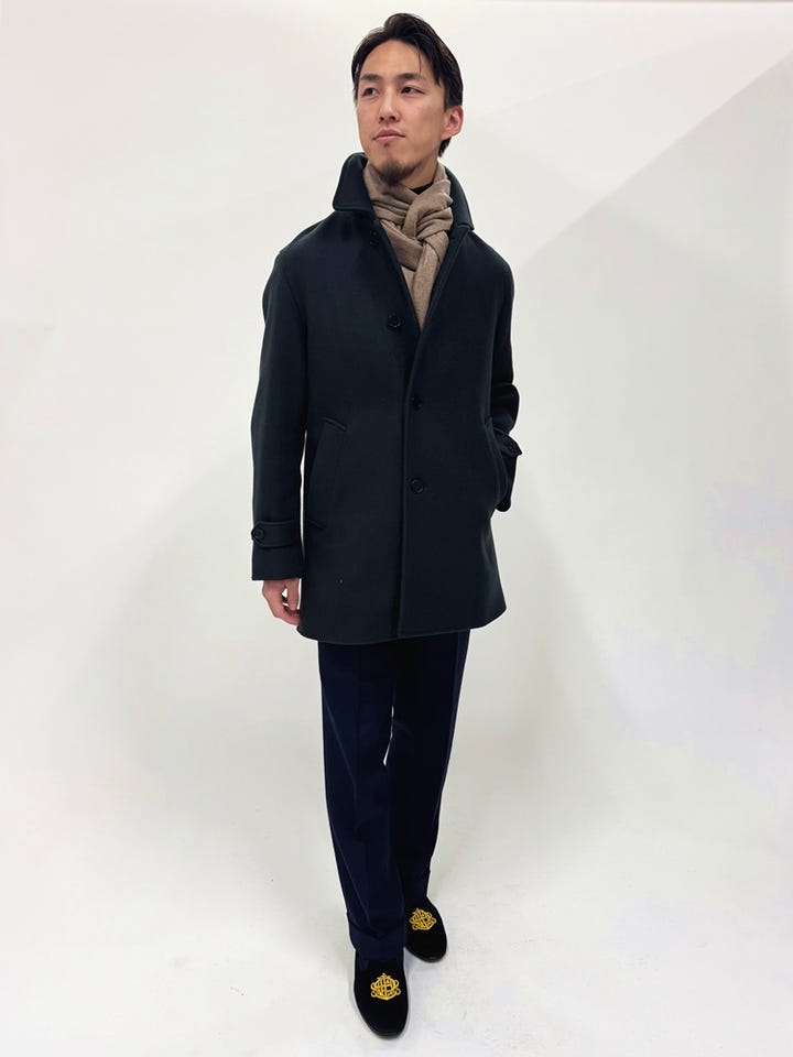 ミディアム丈のカーコートを使用したドレスカジュアルスタイリング。