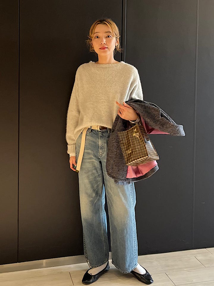 【素材感・着心地】軽く柔らかい毛(フォックス)素材。肩周りは程よくゆとりがある為、インナーを選ばず着用できます。着丈がやや短めなのでボリュームのあるボトムとの相性も抜群です