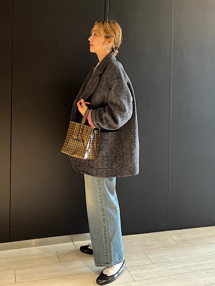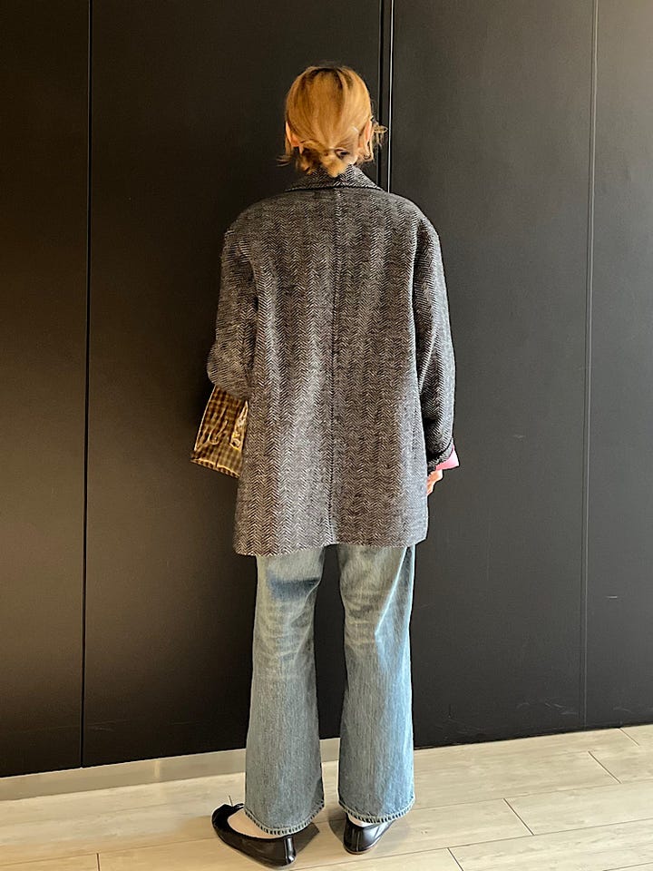 【素材感・着心地】程よい厚みのウール素材。裏地が付いています。肩周り、身幅はゆったりとしておりインナーを選ばず着用できます