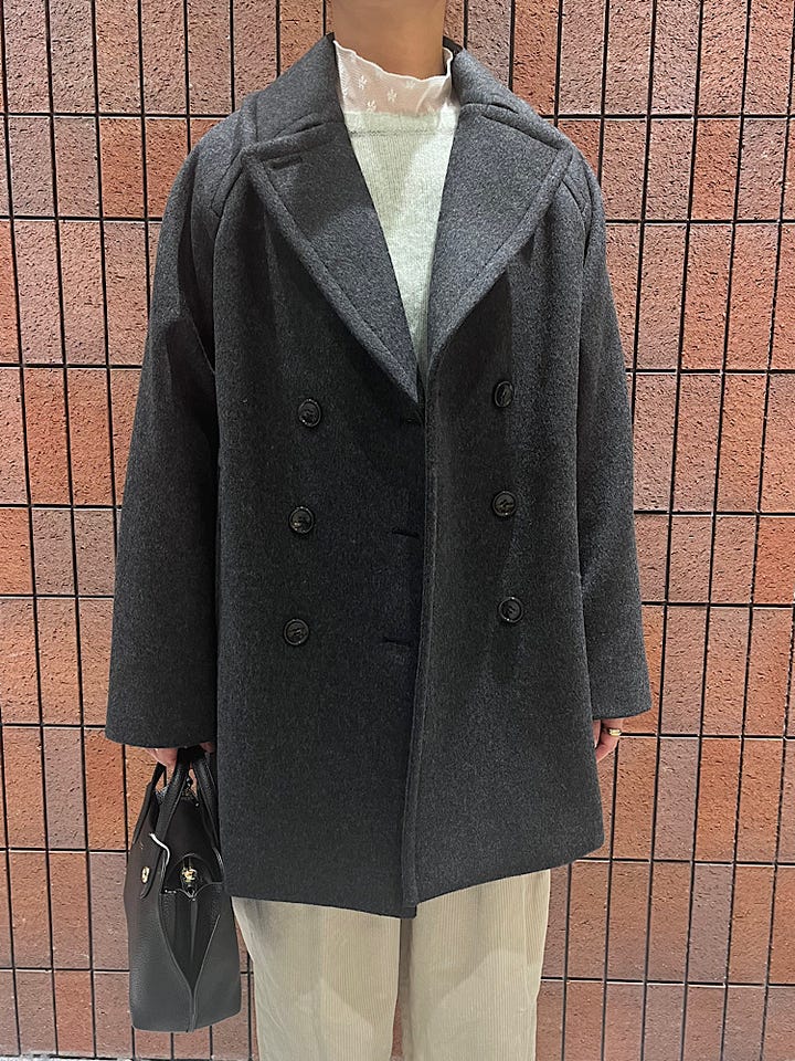 着心地:立体的なフォルムで肉厚なウール素材の裏地ありのPコートです。重過ぎず柔らかな肌触りです。