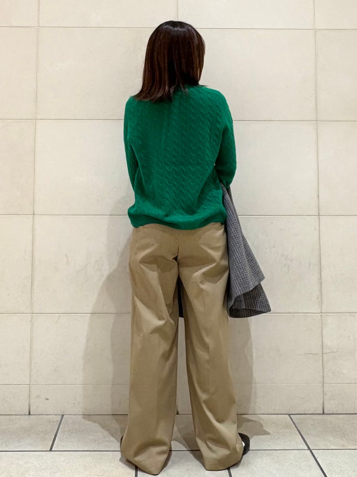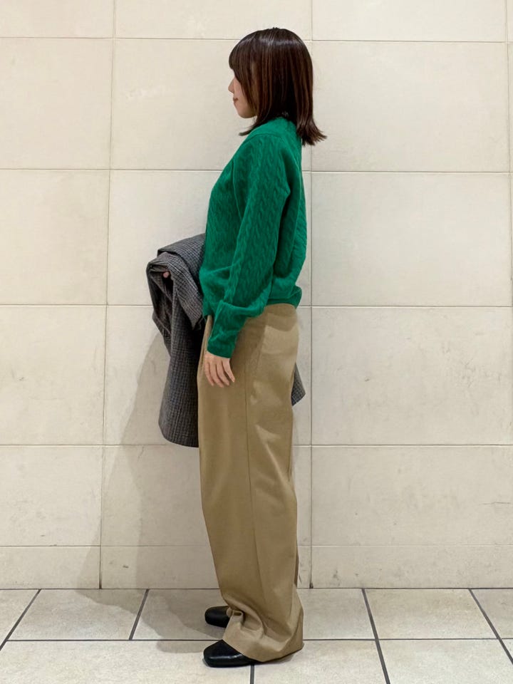 柔らかく動きやすい素材です。なめらかで上品な印象で、きれいめでもカジュアルでも合わせやすい万能アイテムです。軽いですがしっかりとした生地で、真冬でも活躍します。