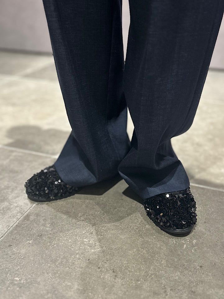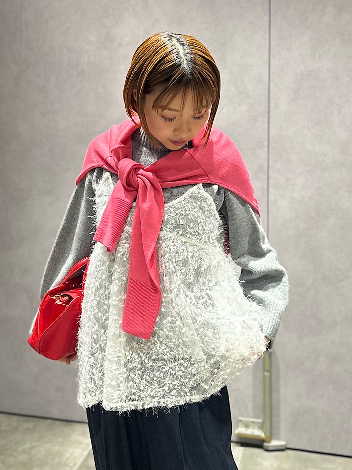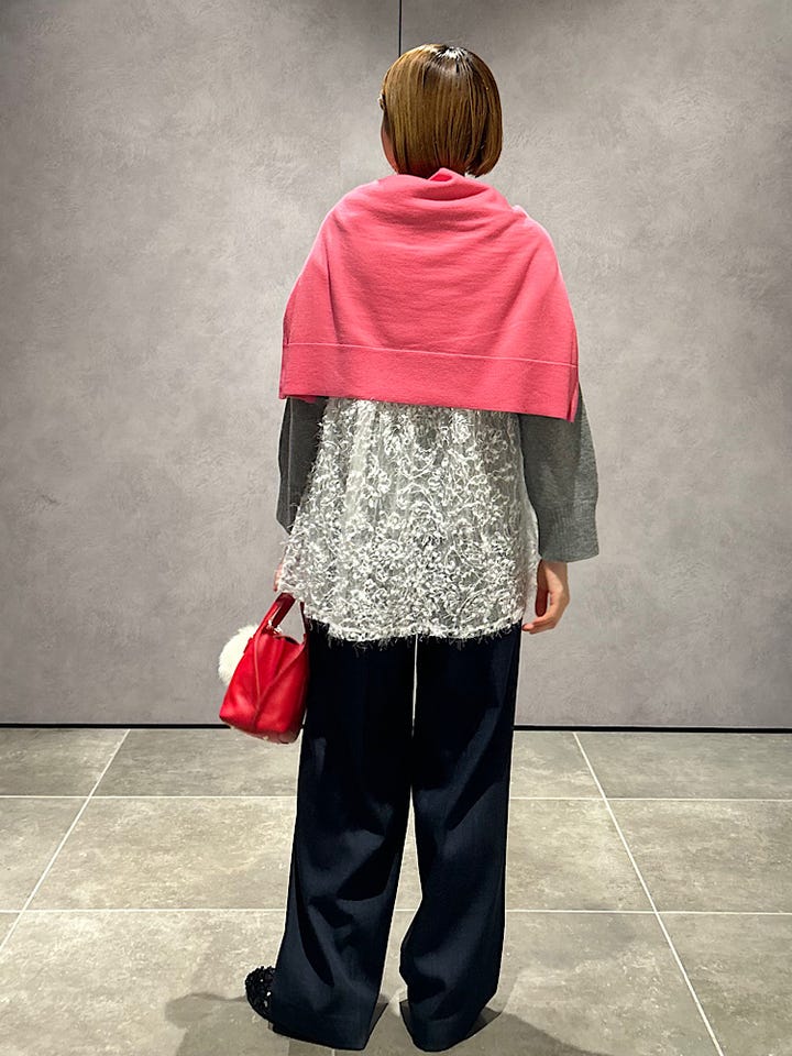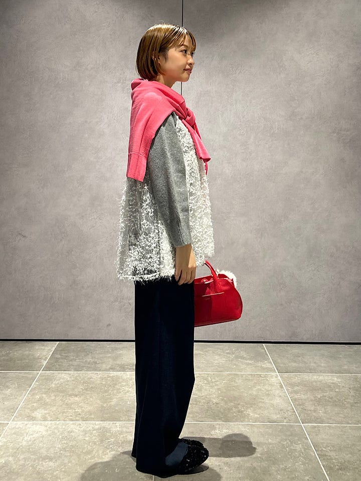 素材感・着心地:ニットにもストレスなくレイヤードしやすいフィット感です。今回はニットの上から重ねましたが、ニットの中に仕込んできらっと裾を見せるコーディネートもホリデーシーズンにおすすめです。
