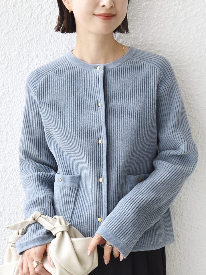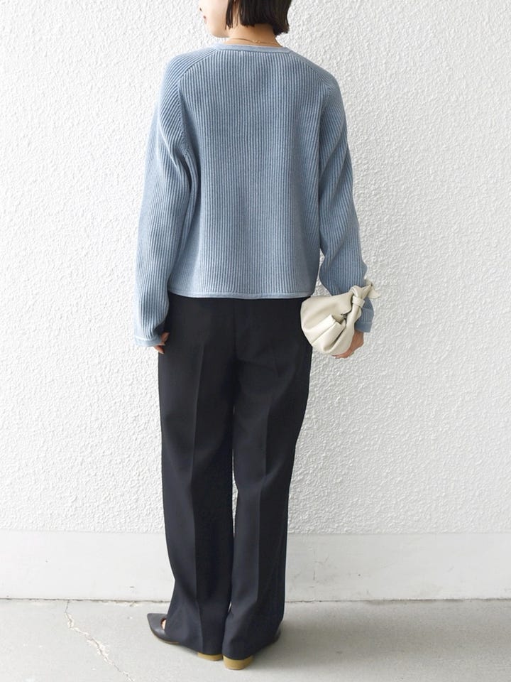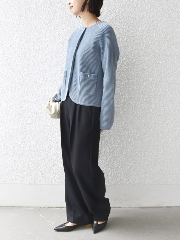 着心地:中肉でしっかりとした編み地なので、ジャケットのようなきちんと感がありながら、ニットらしい柔らかな着心地です。