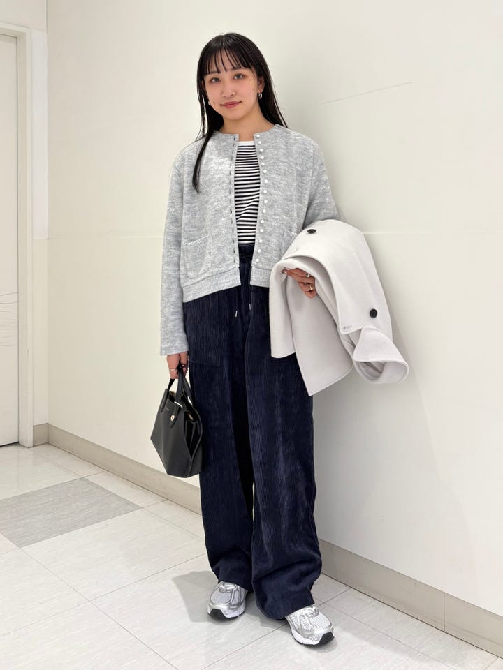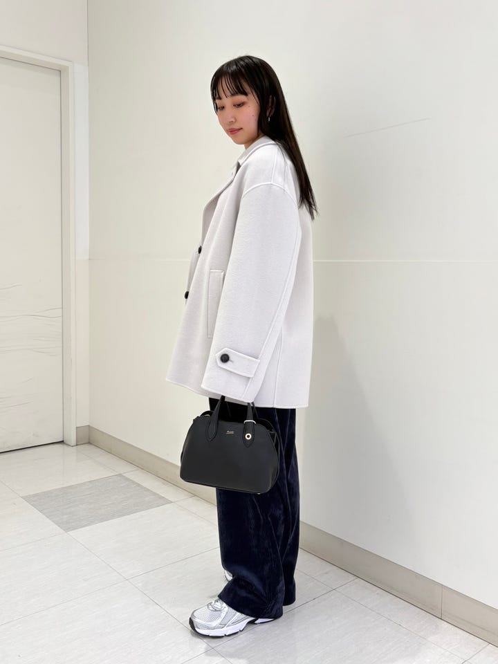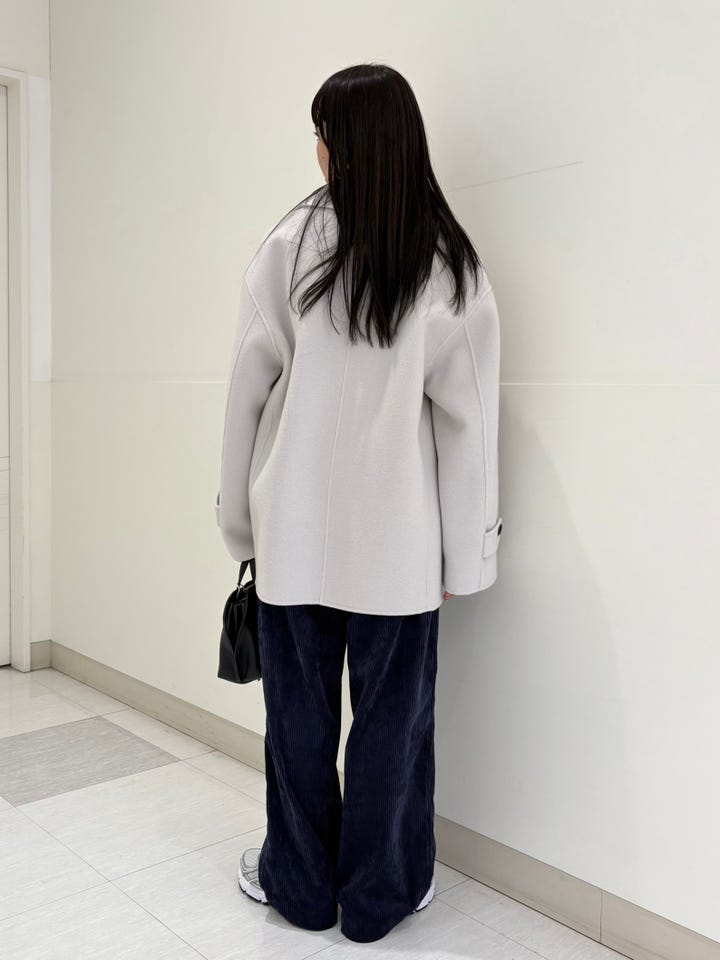 ウール素材ですが、とても軽い着心地です。 ゆったりとしたサイズ感で、インナーにスウェットや厚手のニットを着ることもできます。襟元のボタンを閉めると雰囲気を変えて着ることができます。